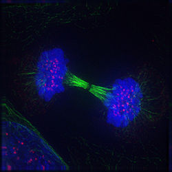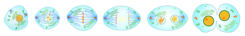 En biología, la mitosis (del griego mitos, hebra) es un proceso que ocurre en el núcleo de las células eucarióticas y que precede inmediatamente a la división celular, consistente en el reparto equitativo del material hereditario (ADN) característico.[1] Normalmente concluye con la formación de dos núcleos separados (cariocinesis), seguido de la partición del citoplasma (citocinesis), para formar dos células hijas. La mitosis completa, que produce células genéticamente idénticas, es el fundamento del crecimiento, de la reparación tisular y de la reproducción asexual. La otra forma de división del material genético de un núcleo se denomina meiosis y es un proceso que, aunque comparte mecanismos con la mitosis, no debe confundirse con ella ya que es propio de la división celular de los gametos (produce células genéticamente distintas y, combinada con la fecundación, es el fundamento de la reproducción sexual y la variabilidad genética).