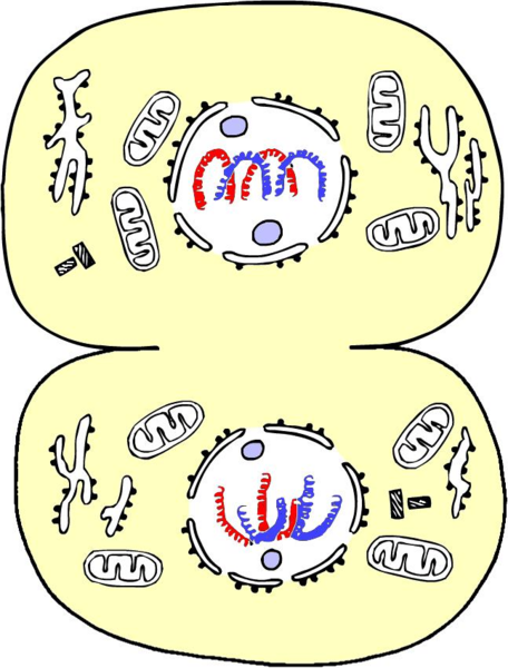 Como hemos podido comprobar, los acontecimientos durante la telofase son prácticamente los inversos de los que mencionábamos para la profase. Por tanto, la imagen que obtenemos para la telofase resulta muy parecida a la de la profase, salvo por un detalle que resolverá todas nuestras dudas: en telofase siempre encontraremos dos células contiguas con el mismo aspecto. Veamos el esquema:
